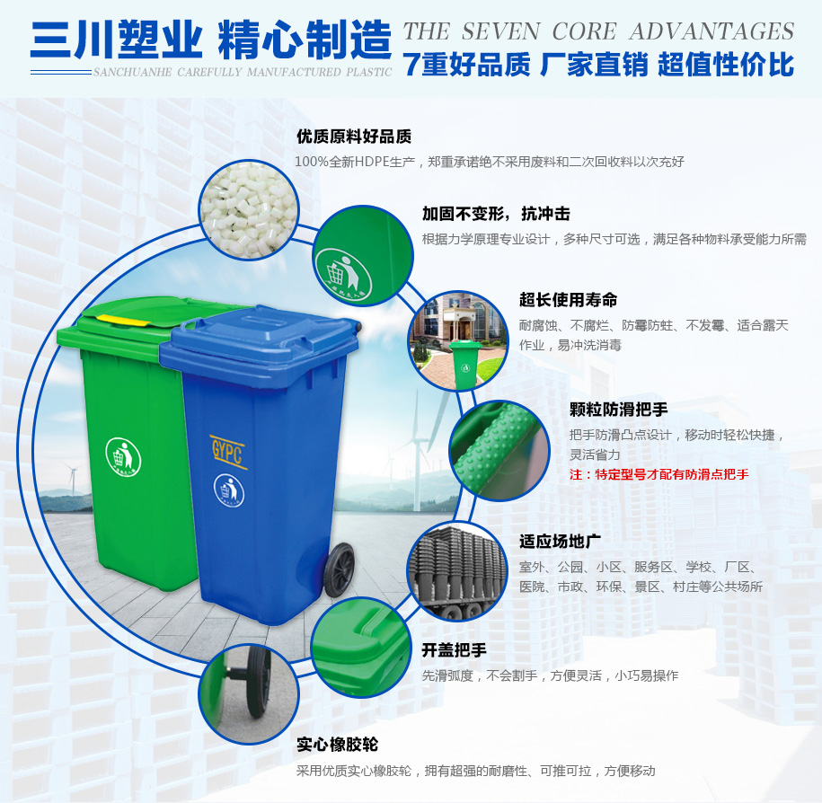 歡迎光臨新鄉三川塑業有限公司官網,主要產品:塑料托盤、環衛垃圾桶、周轉箱